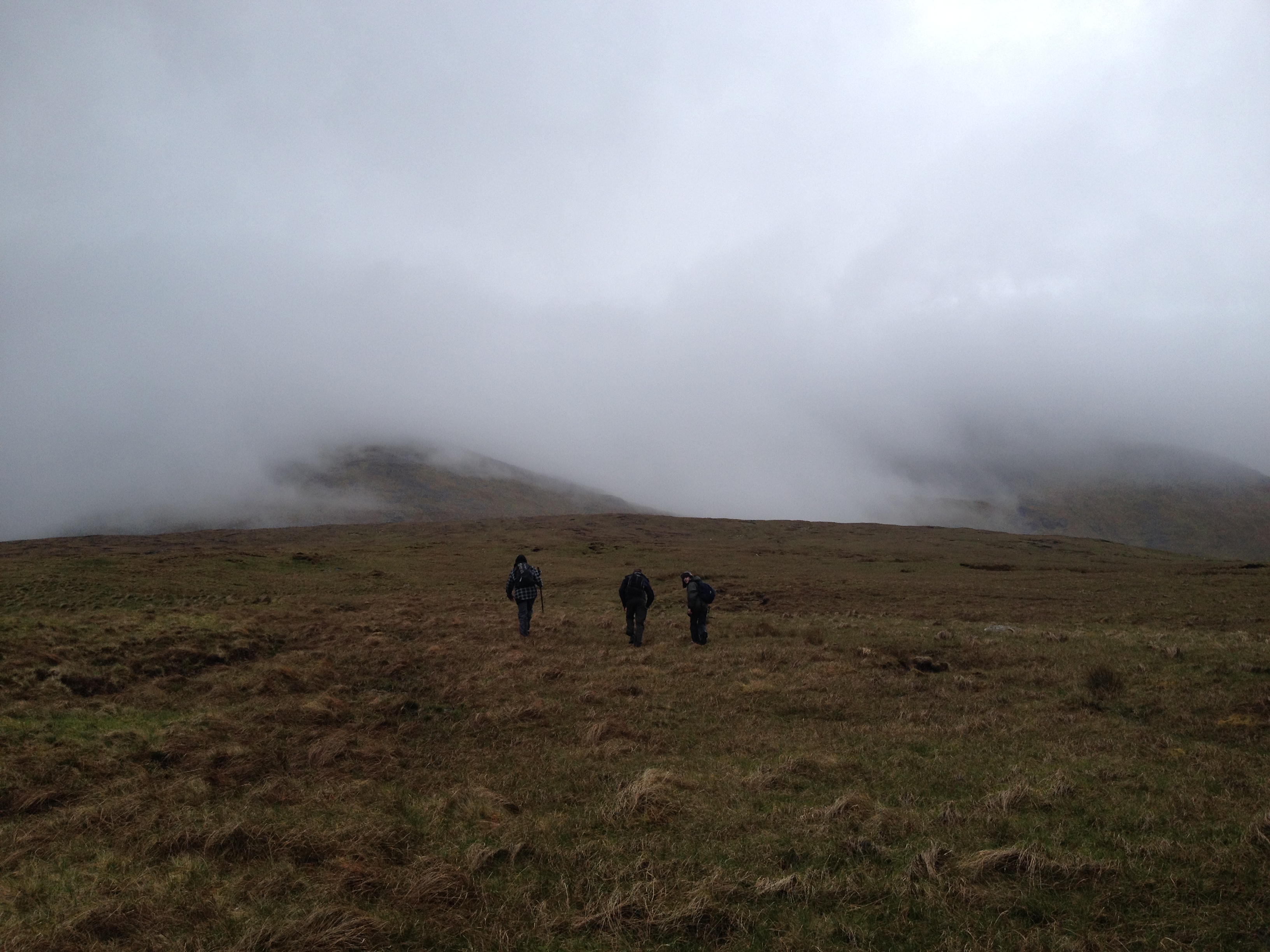 We spent a few moments revelling before we turned for home after some brief discussion about which direction our origin may lay. Without our GPS we would have lacked any confidence in our aim and could have wandered again clueless trying to find the car. It felt like we were walking for hours, descending into what seemed like a never ending field. No sight of the gate we passed through earlier. This was the real slog, tired bodies and on the come down. The car couldn’t come quick enough. The ground was boggy and impossible at times. Offering traction for a moment, giving you that false sense of security, before in an instant removing all grip like a trigger pull and sending you to your arse. Just as well we stand among familiar faces and here fall among friends as any embarrassment can not last long. The mountain makes equal fools of us all. You are rewarded with spectacular views of the surrounding area on the way down, views that I’m sure are all the more pleasing from the top on a clearer day. Unfortunately, from the peak we were staring into what seemed like the clouds. We were given no view from the top, only the sense of achieving what we had failed to do pretty much one year before. It’s totally worth it though.