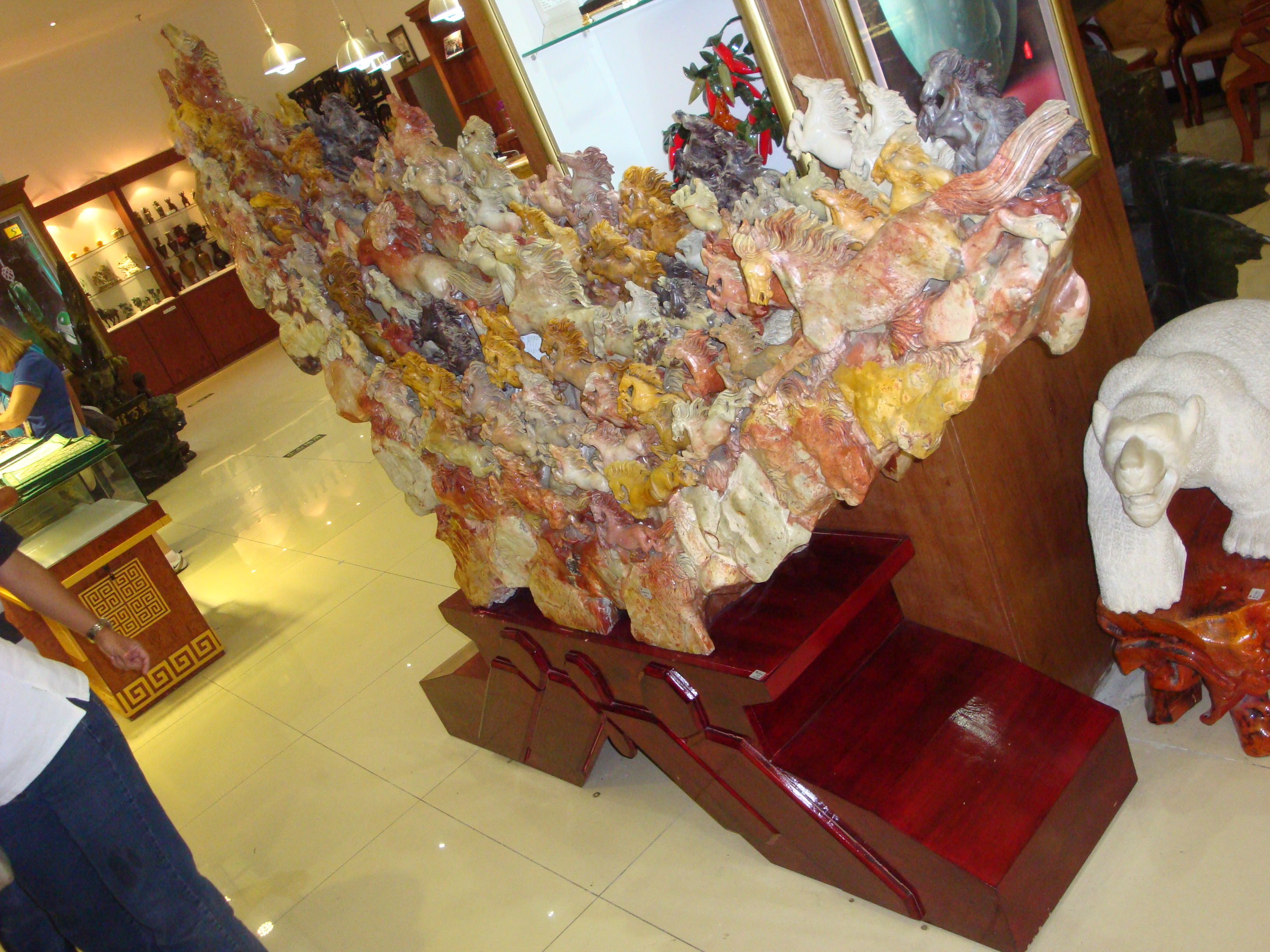 As if to underline my scepticism, we visit a jade workshop where you could purchase a magnificent work for the low low price of $305,000. That’s USD too. Fuck, and there’s people parting with hundreds for small pieces of old rock. The place isn’t really cultural or interesting beyond the craftsmanship involved, though I wonder at the craftsmanship’s authenticity. We only see two people, very much on display behind a glass window, working the jade into some of the smaller pieces which are certainly mass produced, whether it’s by hand or machine. There’s something a little unsettling about the whole experience as our, clearly coached, tour guide exclaims surprise at us thinking the stuff is expensive. She ‘thinks’ it is extremely reasonable. Our disbelief is not at the cost of this jade but at the cost of jade, and the value of it. Yes it is beautiful, but what are we buying? The rock or the craft? We grab an early lunch, at around 10:30am, gas. It does turn out to be a nice break from the tour though, and we get talking to some of our tour companions. Everything settles back to normal for an hour or so, before we push on having been presented with some pretty decent food. Especially considering the venue. A jade workshop can make a good restaurant, in China anyway.