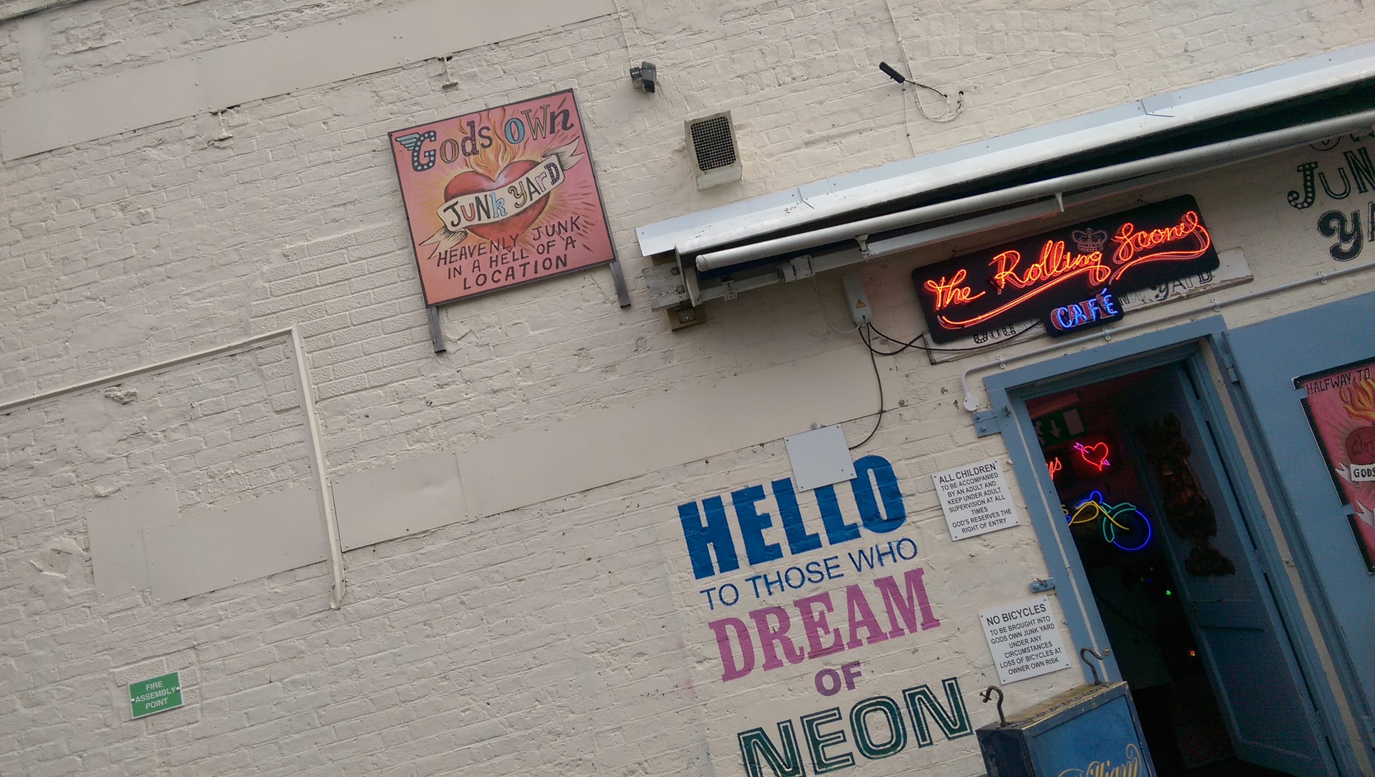 Saturday morning comes around pretty quick. I’m fairly sure I was asleep before my head hit the pillow! We’re treated to a lovely breakfast by our outrageously kind hosts. It’s a great way to wake up on day 2. We promptly make a move, headed for God’s Own Junk Yard. What a great name. It’s a bizarre and kind of inspiring collection of neon signs and oddities. You could lose hours in there in complete distraction. A relaxed approach to art with a café/bar, couches and the artist just hanging around. No pressure to carefully tip-toe around precious displays. The next building over houses the Wild Card Brewery, a small beer producer that started up in Walthamstow in January 2014, funded by peer-to-peer lending from locals. Maybe there is hope for us yet. All four of us go with the aptly named King of Hearts, a blonde beer served by none other than Jaega Wise, the head brewer. It’s hard to believe this sublime nectar comes from the same place that afflicted us with East 17. Great beer, good music and a welcoming atmosphere. You can’t really go wrong.